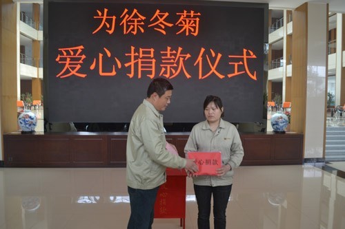 当接过公司领导转交过来的36105元爱心捐款时,徐冬菊的泪水禁不住流下脸颊。这是近日发生在康平纳集团感人的一幕。 徐冬菊是康平纳毛纺织公司职工,家里有需要赡养的老人及两个上学的孩子,2012年9月对象被确诊患结肠及淋巴肿瘤,医治期间支出的巨额费用,对于本已经济拮据的家庭来说,简直是雪上加霜。 病魔无情人有情,2012年10月康平纳集团启动“爱心帮扶基金”对陈冬菊进行帮扶,然而面对源源不断的巨额费用,她的压力可想而知。2013年4月23日集团总公司倡议并开展了为陈冬菊现场捐款活动,在集团董事长陈队范的带动下,全体职工积极响应,无论是朝夕相处的,还是素未谋面的,都纷纷伸出授助之手为陈冬菊献出自己的一份爱心,展示了“一人有难八方帮,共同援手显真情”的感人场面。 命运无情,人间有爱。此次捐款活动只是一个插曲,从看望驻地村孤寡老人,到出资支持驻村小学建设;从看望聋哑儿童,到捐资助学;从帮扶公司困难职工,到为华源矿难、玉树地震、汶川地震、舟曲特大泥石流等灾害积极捐款,康平纳集团爱心奉献一直在继续……