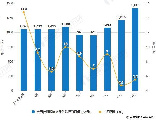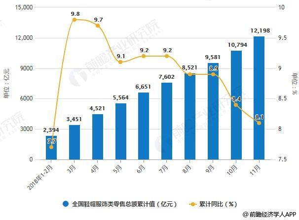 2018年1-11月全国鞋帽服饰类零售总额统计及增长情况